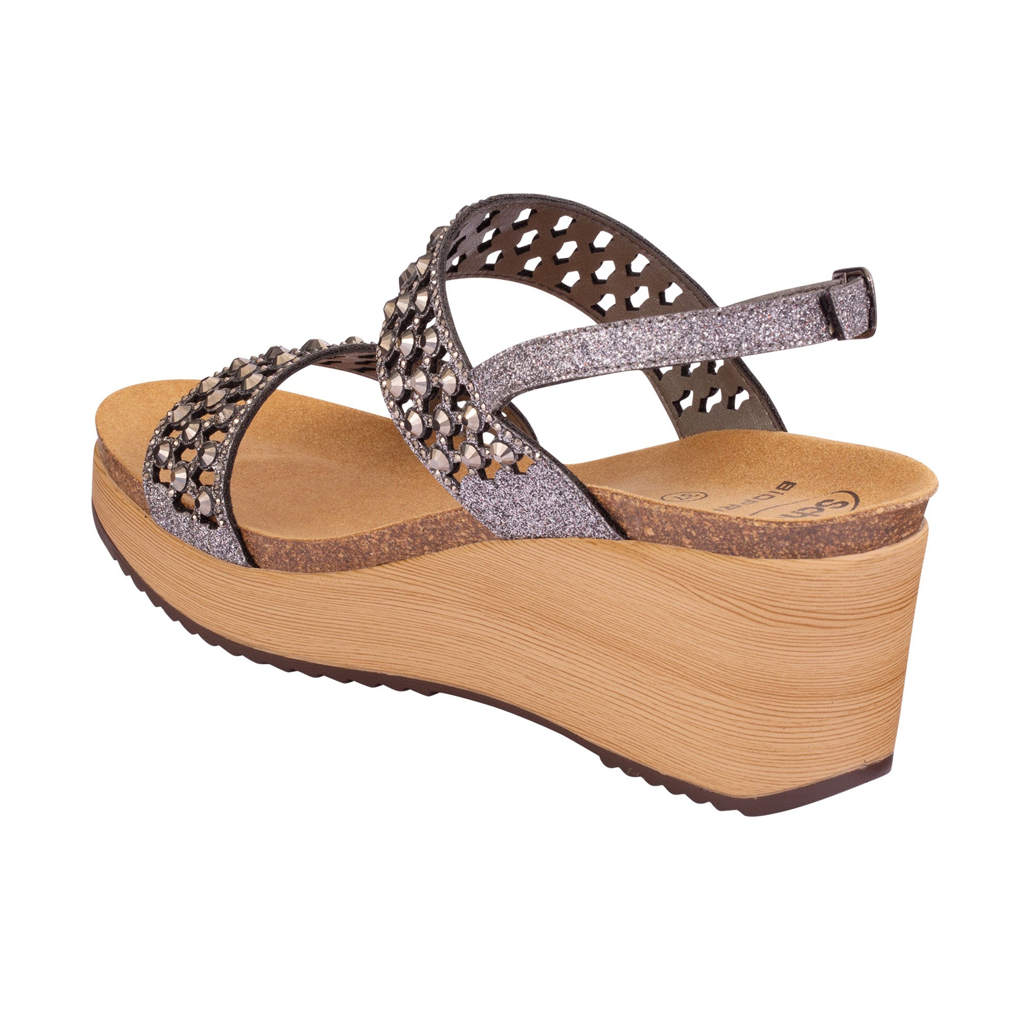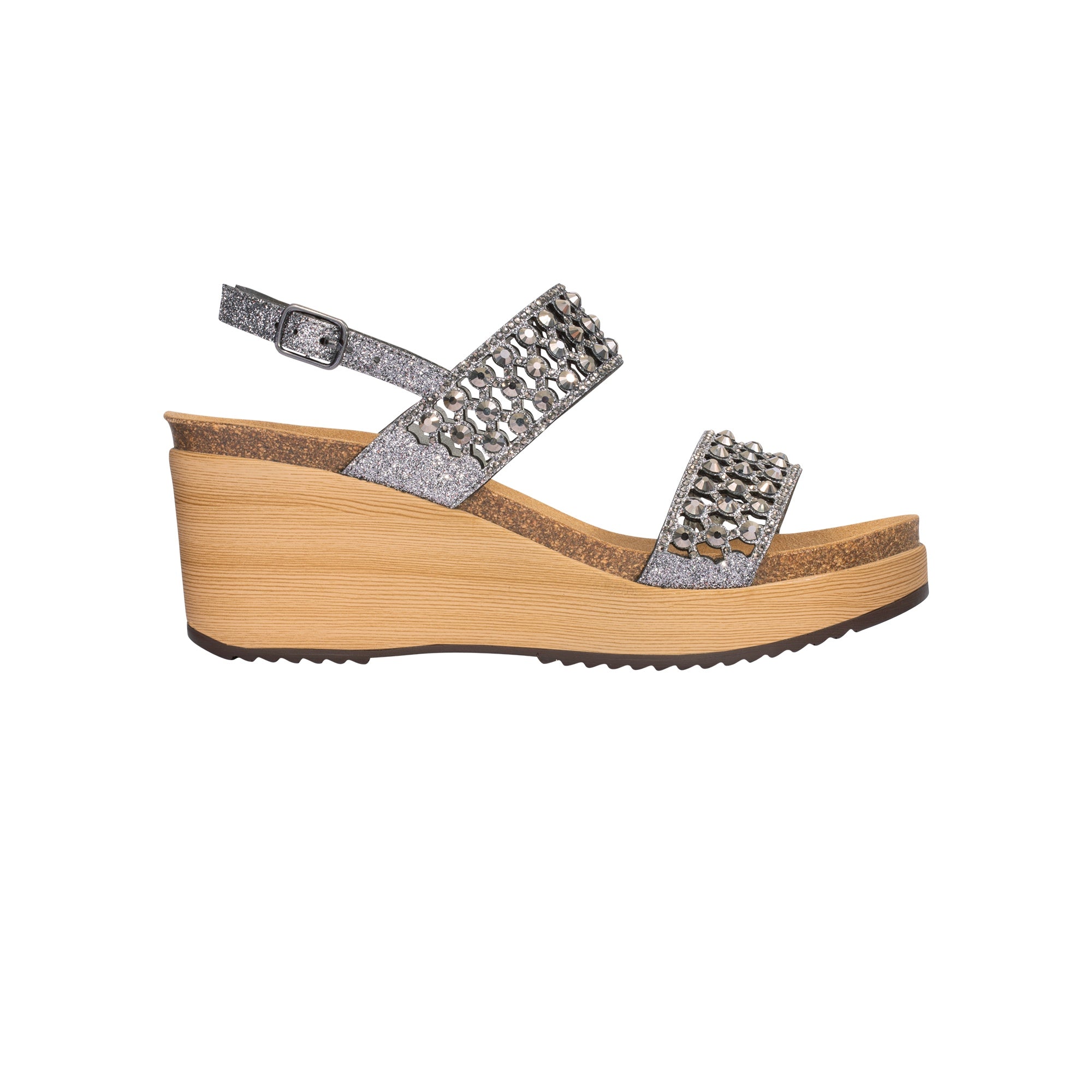 Truly love at first sight for all women who love rhinestones and sparkling details who are seeking footwear that perfectly blends these elements with comfort and stability, all of which are topped with a high wedged heel characterised by a two-band upper that embraces your foot, making it beautiful and elegant. Its ultra-light wood effect wedge heel is extremely modern and fashionable. Its slip-resistant sole ensures stability and makes it possible to walk long distances in total comfort. Moreover, the footwear is flexible, light and fitted with Scholl Bioprint® technology with its characteristic natural cork and rubber insole designed to help keep your foot in the right position. As from today, the Scholl Bioprint® insole has a soft core that will make your walking even more comfortable thanks to its new formula.