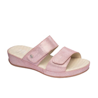 Christy is one of the Scholl styles characterised by a Memory Cushion® Massage technology insole. The soft insole helps re-distribute pressure, while the small waves delicately massage the sole of your foot. Its upper in bright suede leather and the Velcro strap on the two bands (one at the front and one at the back) guarantee the utmost comfort and perfect adjustability. The logoed metal plate at the end of the Velcro strap makes the footwear easier and quicker to put on. The wide fitting (G) ensures excellent wearability.