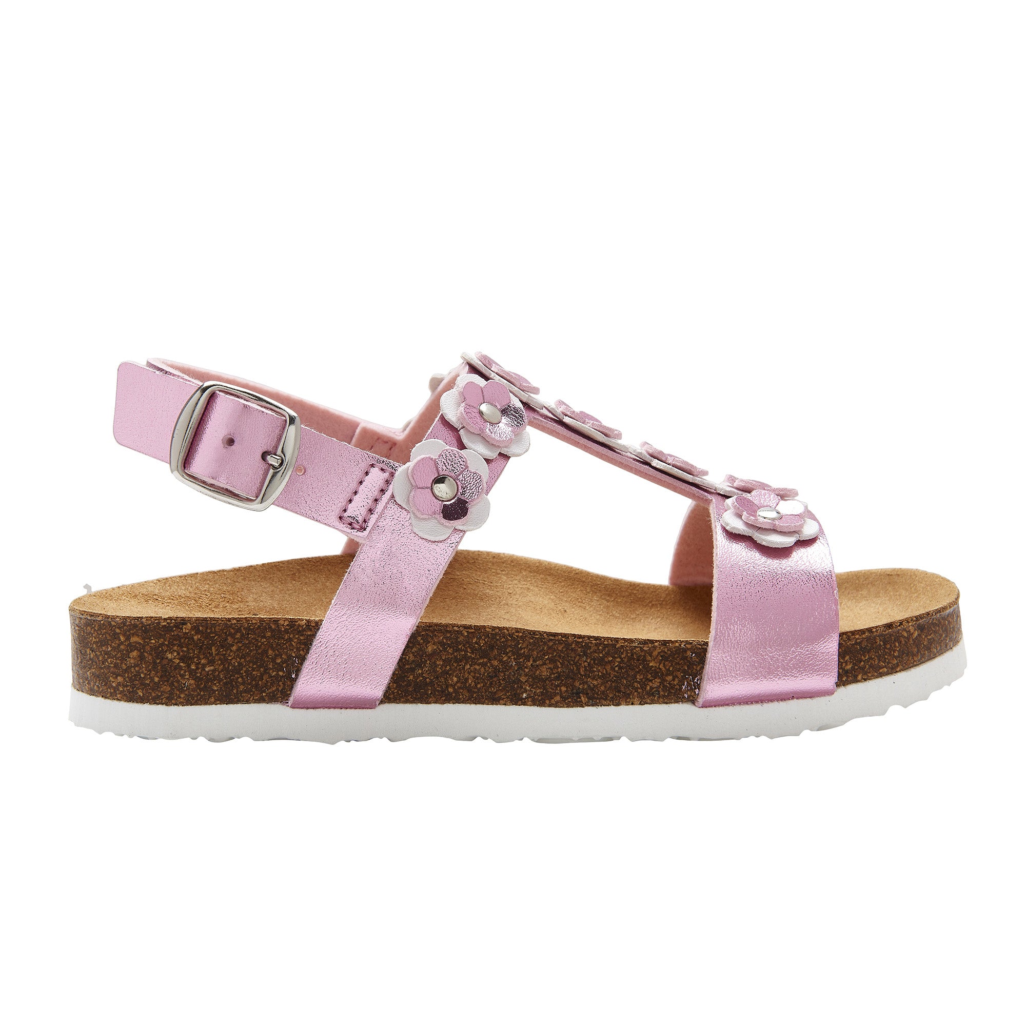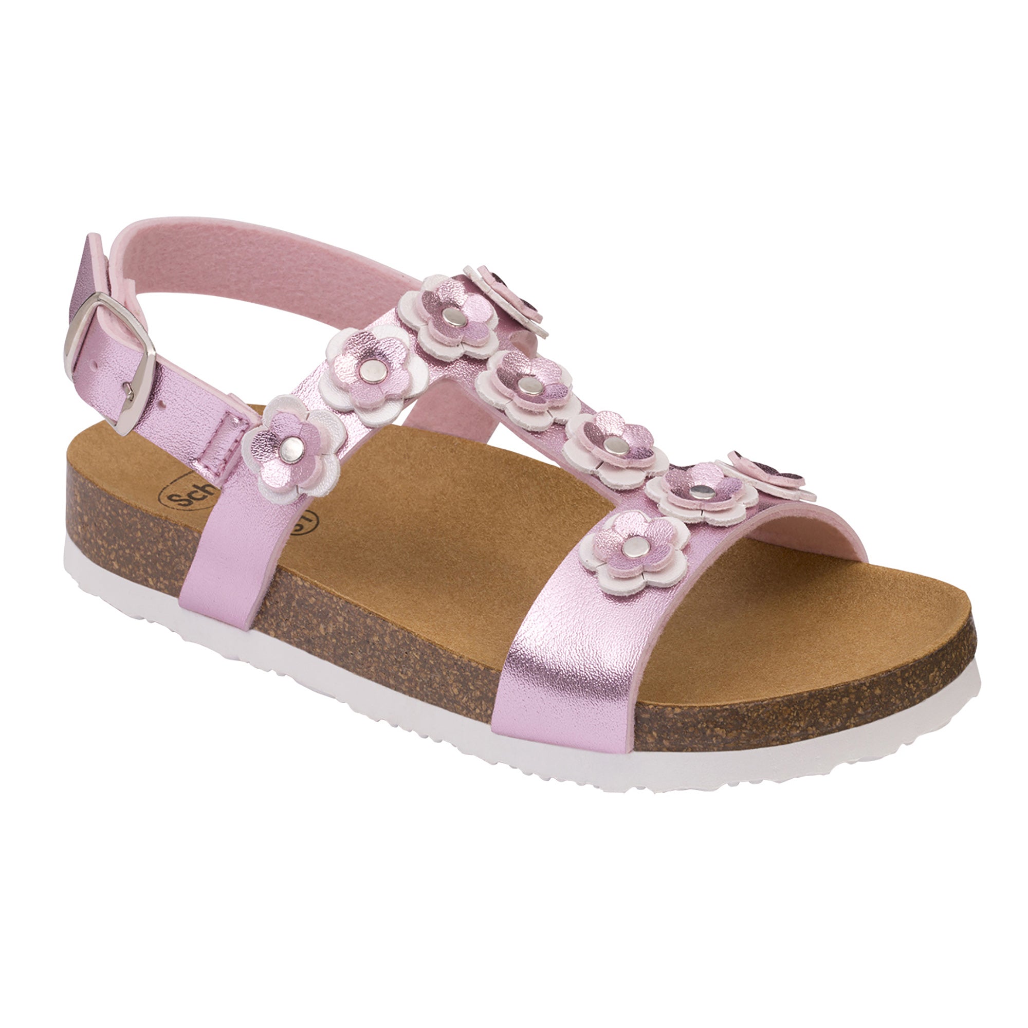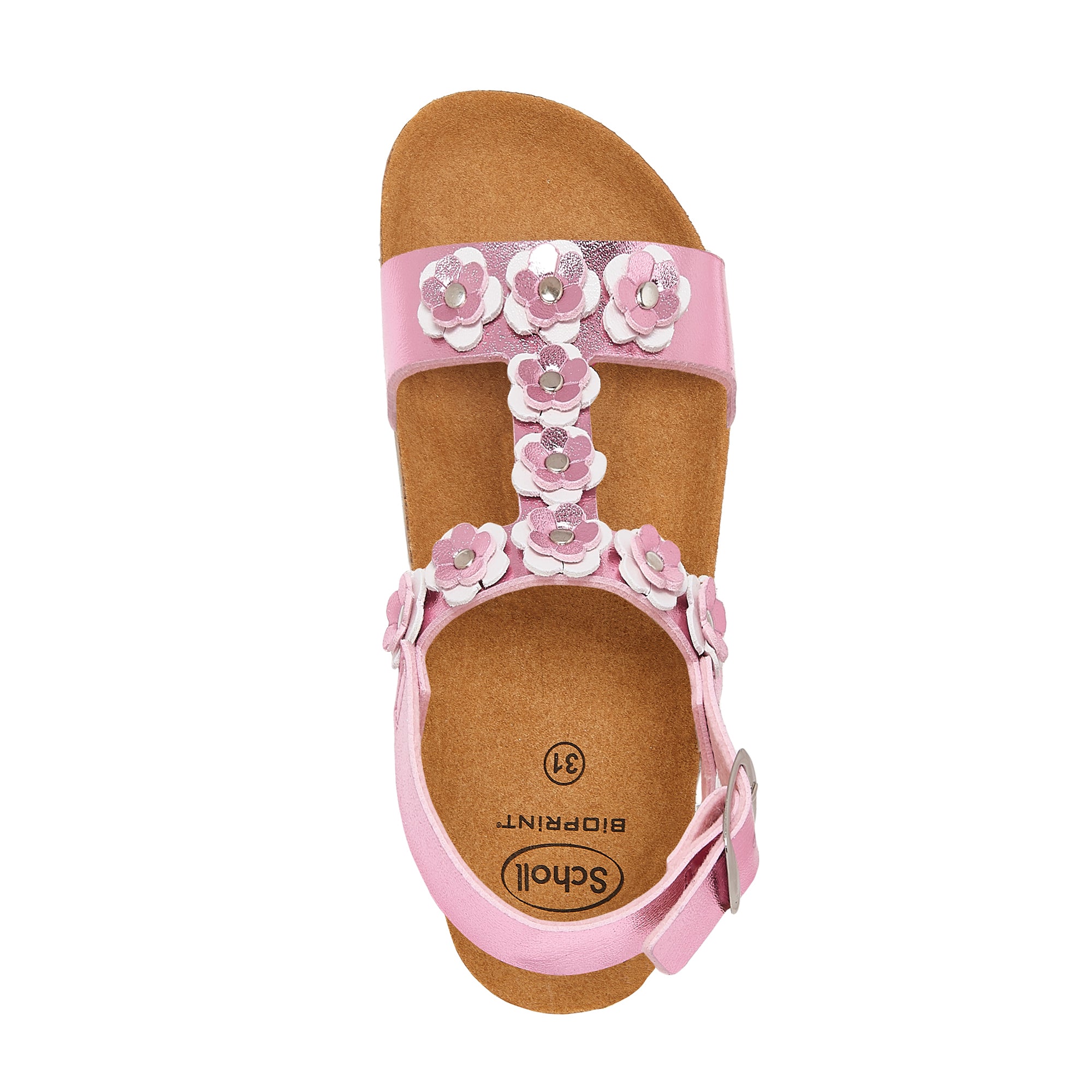 Daisy Kid is the sandal that every little girl desires! A nice upper that softly embraces her foot and which enables the utmost adjustability. Kaily Kid is characterised by a Scholl Bioprint® technology insole that thanks to its ergonomic design makes it possible to maintain the correct alignment of the upper limbs having positive effects on the posture of the foot. Thanks to the composition of the natural cork and rubber insole, the footwear is particularly flexible and perfect for the well-being of younger children. The slip-resistant sole provides greater safety. The ergonomics of the insole have been studied especially in a different way for younger children (who wear sizes ranging between 27 and 31) with a less accentuated shape. Differently, footwear sizes from 32 to 34 are characterised by the classic Scholl Bioprint® anatomical shape.
