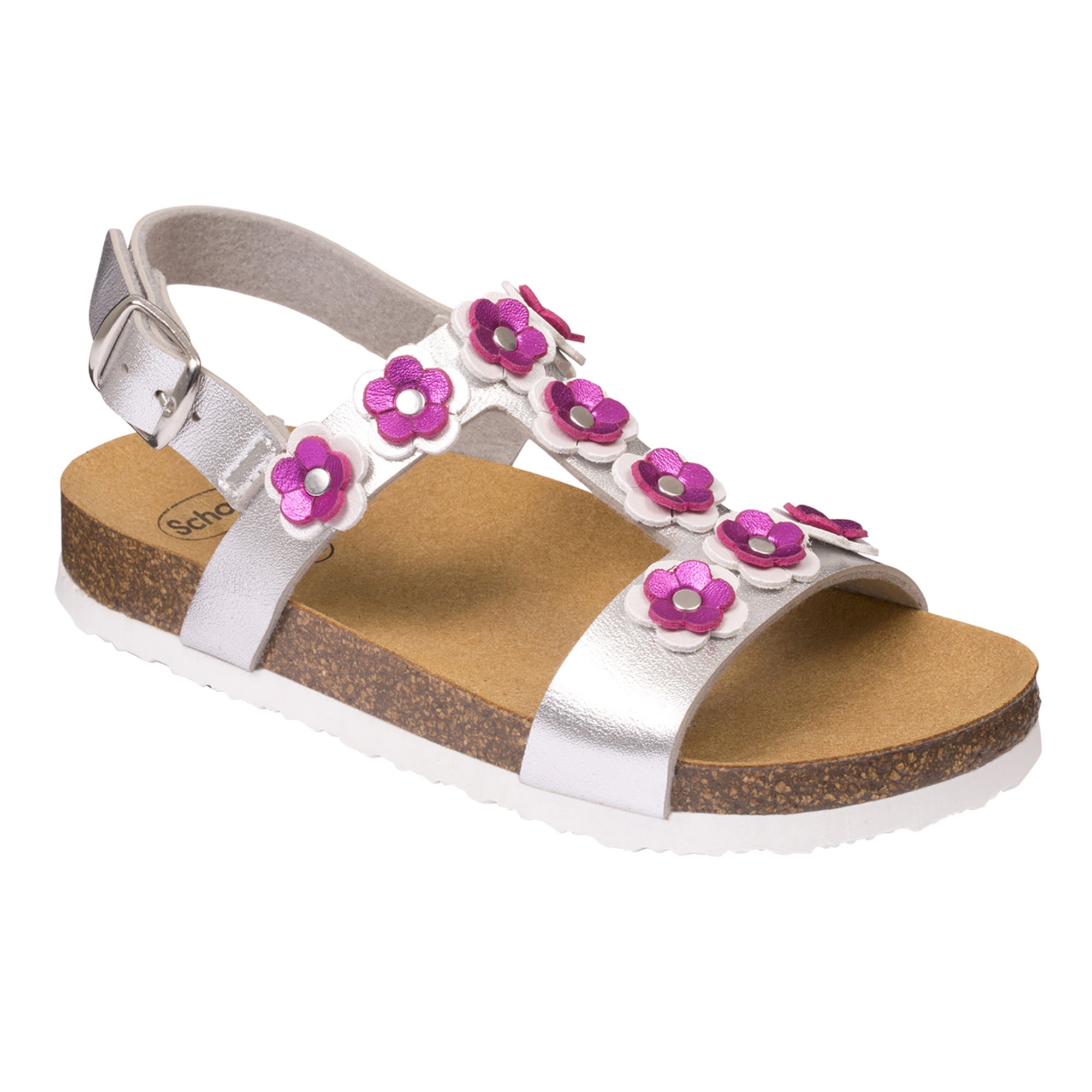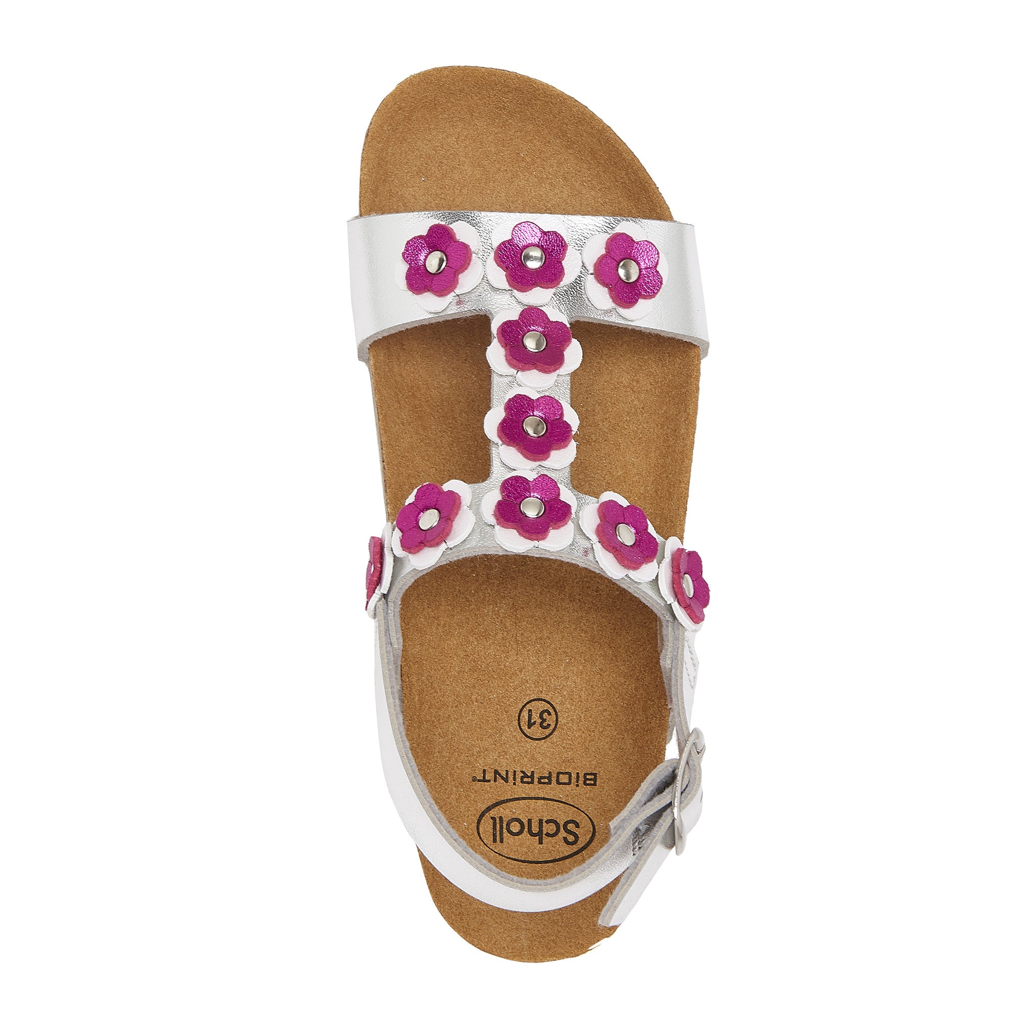 Daisy Kid is the sandal that every little girl desires! A nice upper that softly embraces her foot and which enables the utmost adjustability. Kaily Kid is characterised by a Scholl Bioprint® technology insole that thanks to its ergonomic design makes it possible to maintain the correct alignment of the upper limbs having positive effects on the posture of the foot. Thanks to the composition of the natural cork and rubber insole, the footwear is particularly flexible and perfect for the well-being of younger children. The slip-resistant sole provides greater safety. The ergonomics of the insole have been studied especially in a different way for younger children (who wear sizes ranging between 27 and 31) with a less accentuated shape. Differently, footwear sizes from 32 to 34 are characterised by the classic Scholl Bioprint® anatomical shape.