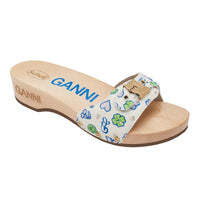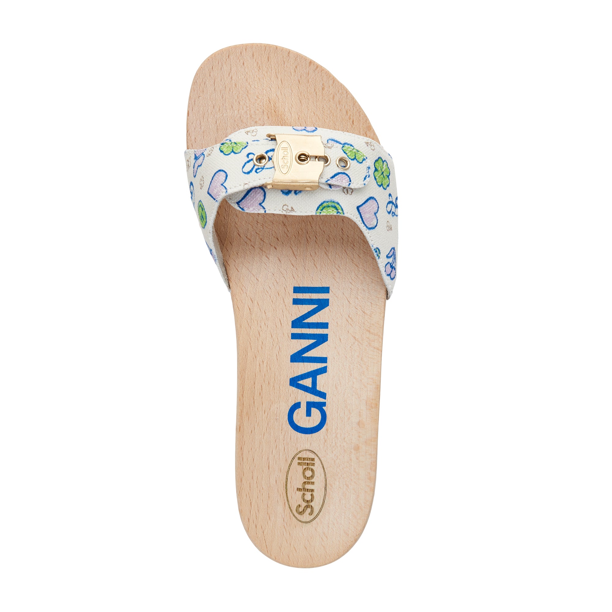 Pescura is the original wooden mule by Scholl, a true 1970s icon and must-have to give a retro touch to any look. In this variant Scholl teamed up with Danish fashion brand Ganni re-imagine and celebrate Pescura Heel with signature Ganni prints. Designed and made entirely in Italy with high-quality materials such as the pure beechwood base and the fully adjustable cotton upper.