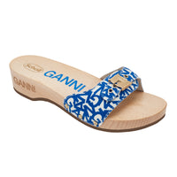 Pescura is the original wooden mule by Scholl, a true 1970s icon and must-have to give a retro touch to any look. In this variant Scholl teamed up with Danish fashion brand Ganni re-imagine and celebrate Pescura Heel with signature Ganni prints. Designed and made entirely in Italy with high-quality materials such as the pure beechwood base and the fully adjustable cotton upper.
