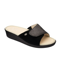 Ledel is slipper with Scholl Memory Cushion® technology, ideal for comfortably standing on your feet all day long. The Velcro closure enables the utmost adaptability of the footwear model, while the comfortable slip-resistant wedge heel allows stability and comfort. The upper has been embellished with sparkling rhinestones.Moreover, the insole has been covered with latest generation microfibre: washable, breathable, anti-odour, hypoallergenic and stain-resistant. Moreover, the insole with Scholl Memory Cushion® technology adapts itself to the shape of your foot and helps redistribute pressure all over the entire sole, leaving you with a sensation of lightness.