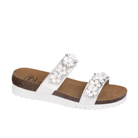 Take a carefree stroll towards the wonderful summer days with Scholl Letizia Sandals. It'll seem as if you are walking in a flowering meadow thanks to their upper upon which tone on tone flowers blossom with sparkling rhinestone in the centre. In addition to the elegance, there is also the unfailing Scholl functionality of the Velcro opening on the instep. Moreover, the footwear is flexible, light and fitted with Scholl Bioprint® technology with its characteristic natural cork and rubber insole designed to help keep your foot in the right position. As from today, the Scholl Bioprint® insole has a soft core that will make your walking even more comfortable thanks to its new formula.