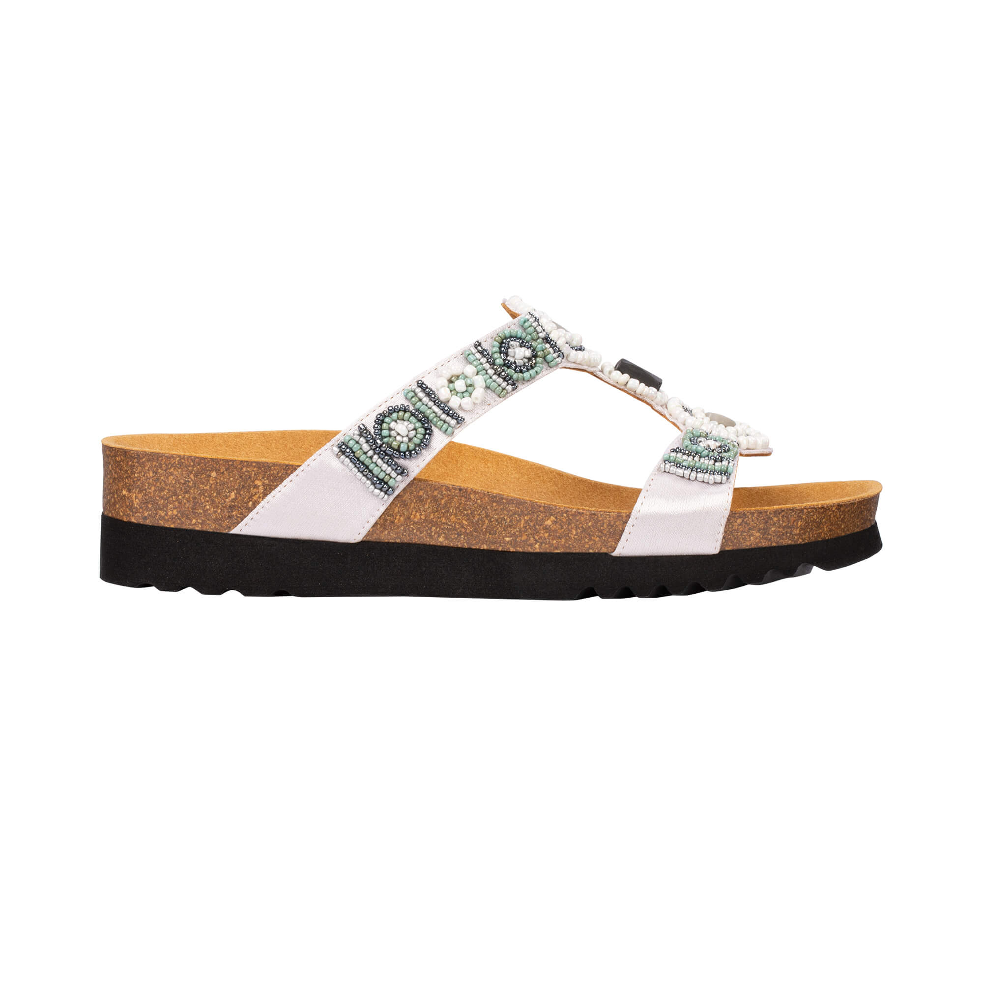 New Bogotà is the real cult Scholl sandal that for decades has won Scholl Lovers over with the interplay of the colours of its hand-braided pearls enliven summer days. A casual, feminine model with a double band fabric upper that delicately embraces your foot.Moreover, the footwear is flexible, light and fitted with Scholl Bioprint® technology with its characteristic natural cork and rubber insole designed to help keep your foot in the right position.