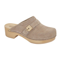 Pescura is the original wooden mule by Scholl, a true 1970s icon and must-have to give a retro touch to any look. Designed and made entirely in Italy with high-quality materials such as the pure limewood base and the fully adjustable leather upper. In our re-interpretation of the original Pescura model, the rounded sabot-type toe gives the shoe a bold style.